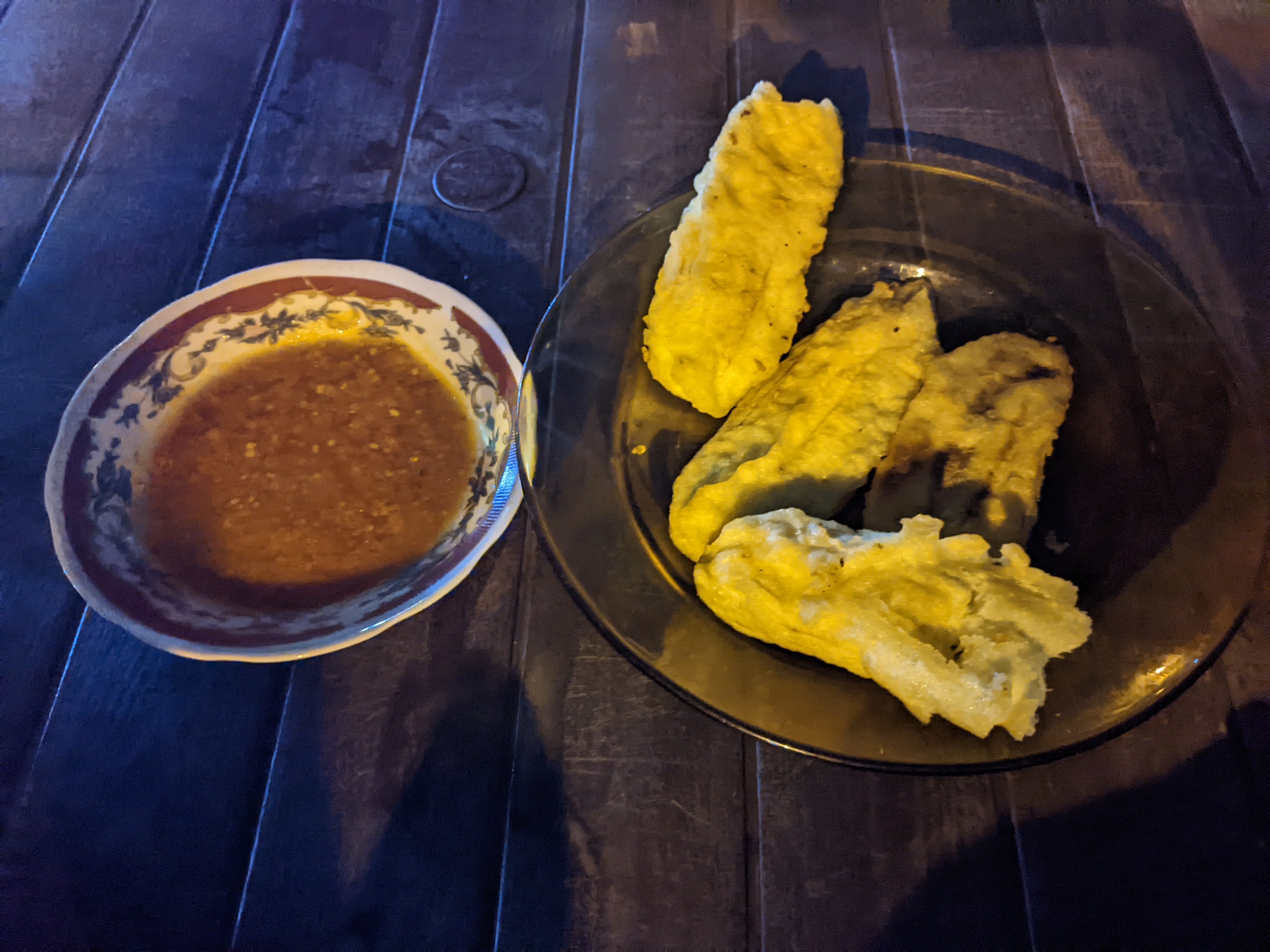 - Des bananes frites que l’on trempe (évidemment) dans de la sauce piquante. Typique de ce que les gens dégustent en prenant un verre à l’extérieur. En l’occurrence lesdits verres sont souvent des boissons très sucrées, typiques également, dont je n’ai hélas ni nom ni photo, tant pis pour vous.