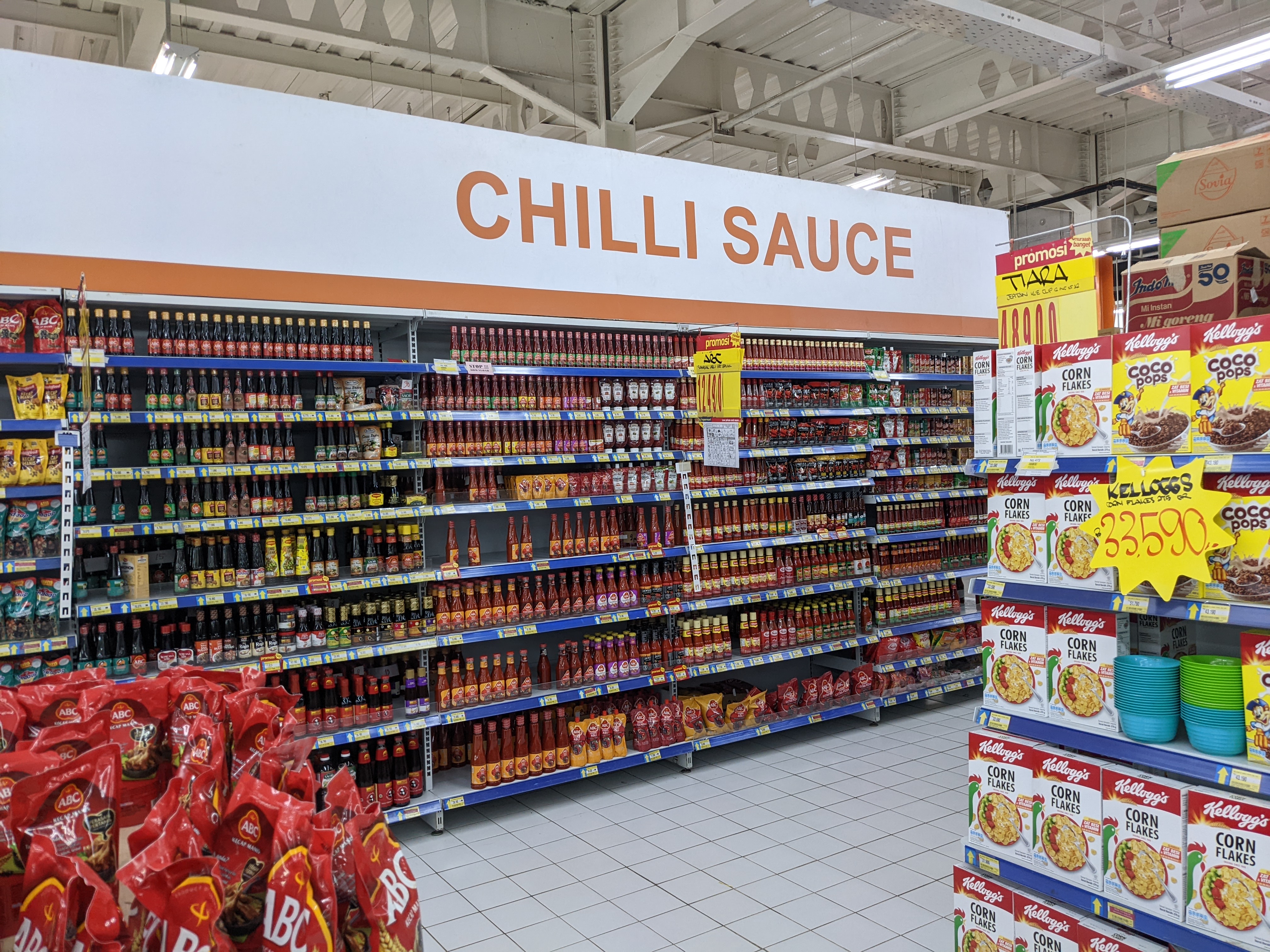 Au passage, quand je vous disais que les Indonésiens aimaient beaucoup la sauce pimentée, visez-moi un peu le rayon du supermarché qui leur est dédié :