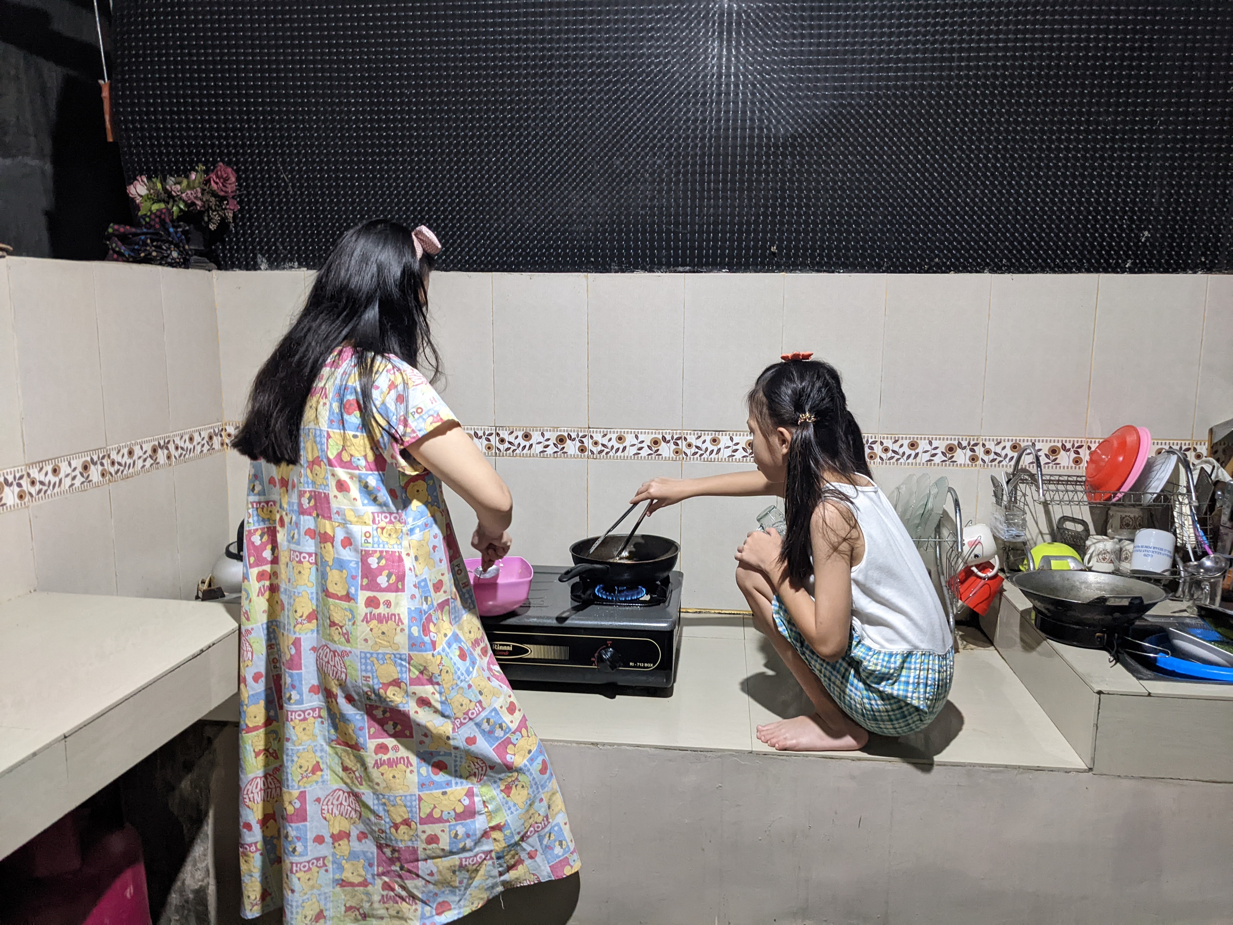 Le plus souvent c’est Mario qui cuisine, parce qu’il a plus de temps, ne travaillant que sporadiquement. Mais souvent cela peut aussi être Gita, qui peut dès lors compter sur l’aide préciseuse de sa fille Liebe !