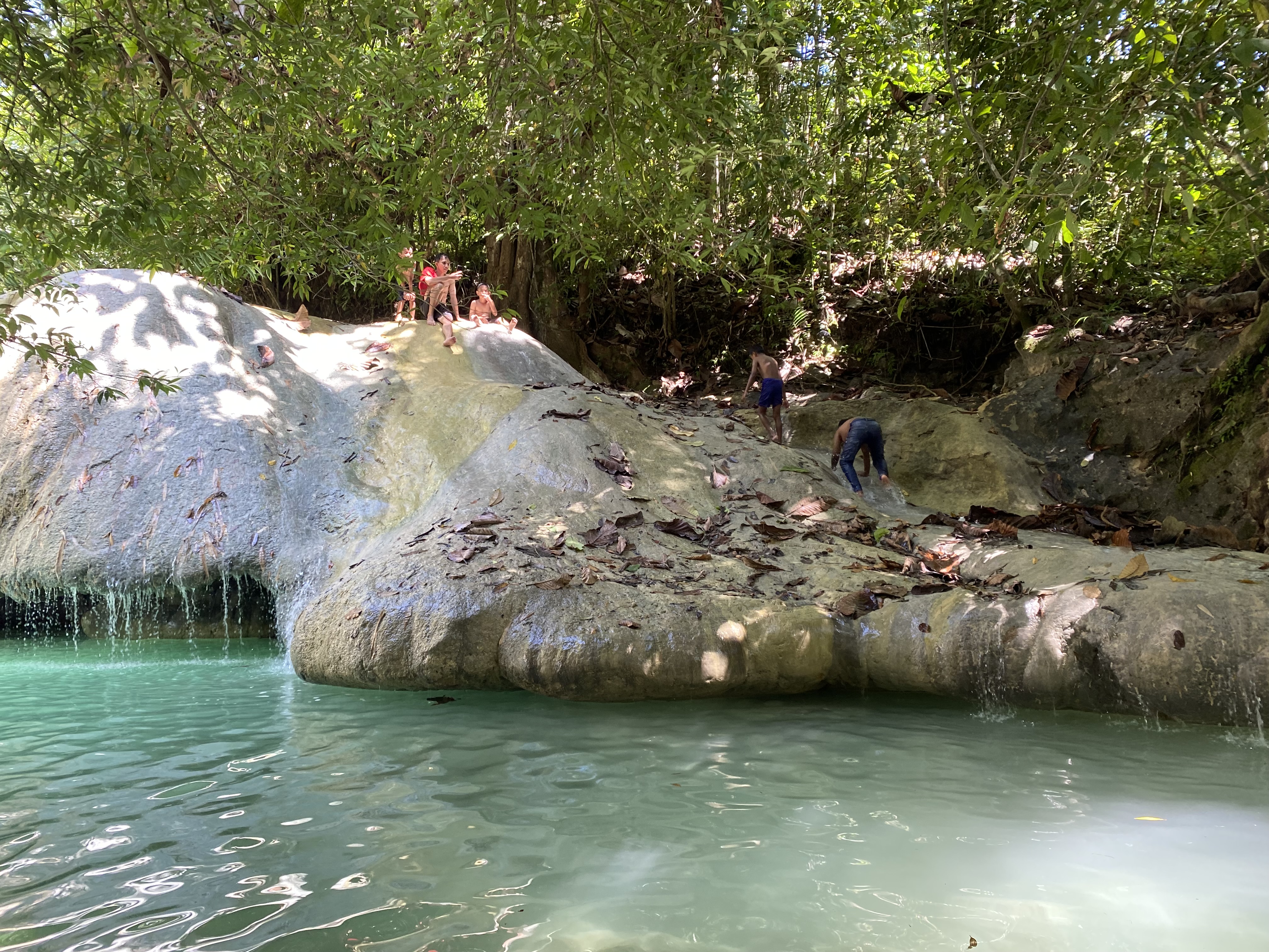 Les enfants s’amusent également à glisser le long des rochers mouillés tel un toboggan naturel.