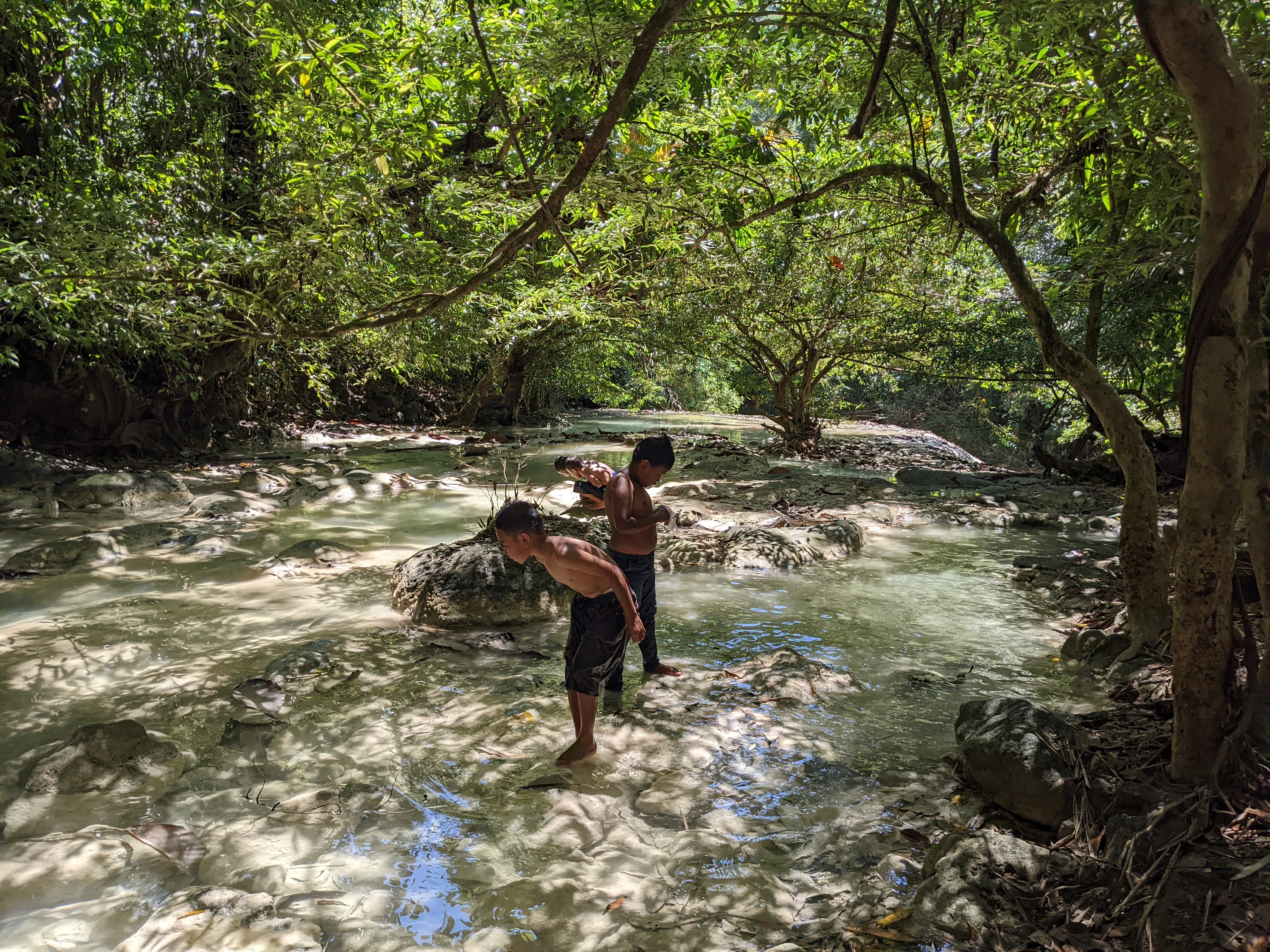 Vers la fin de notre repas, nous découvrons qu’en fait nous ne sommes pas seuls dans cet endroit. En effet des enfants du coin sont en train de s’amuser et de se baigner, en jean évidemment, comme je l’ai déjà vu sur la plage de Lakeba.