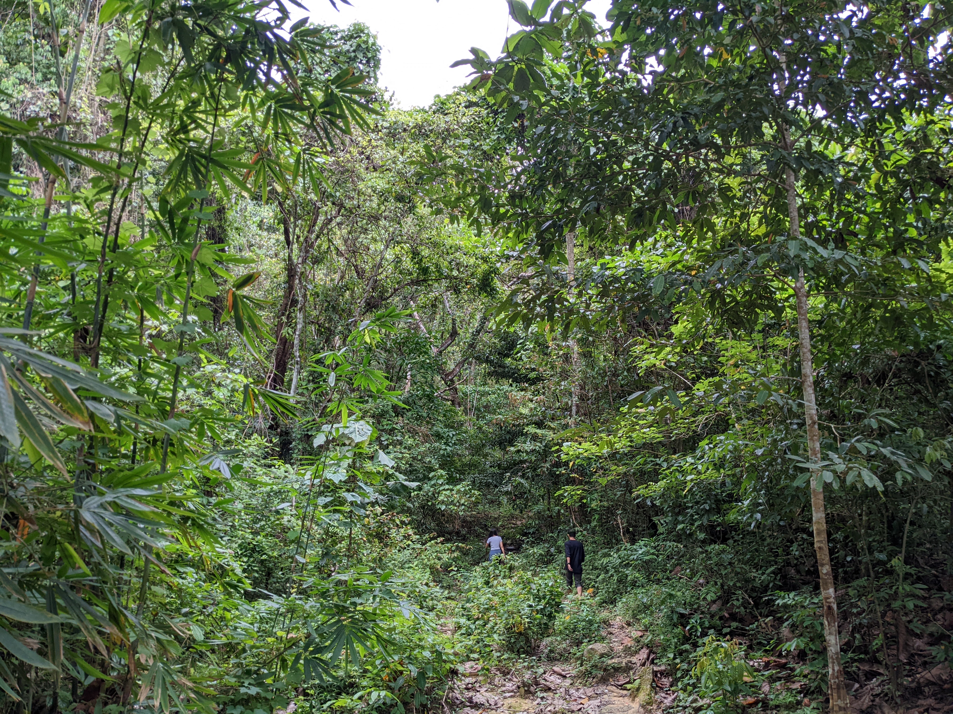 Deux semaines plus tard nous voilà repartis dans un autre endroit mais toujours dans le même but : aller à la découverte de cascade. Nous avançons à nouveau dans la végétation luxuriante, sous le bruit très fort et très bizarre des insectes des alentours : on dirait des sortes de machine électriques, c’est limite un peu flippant.