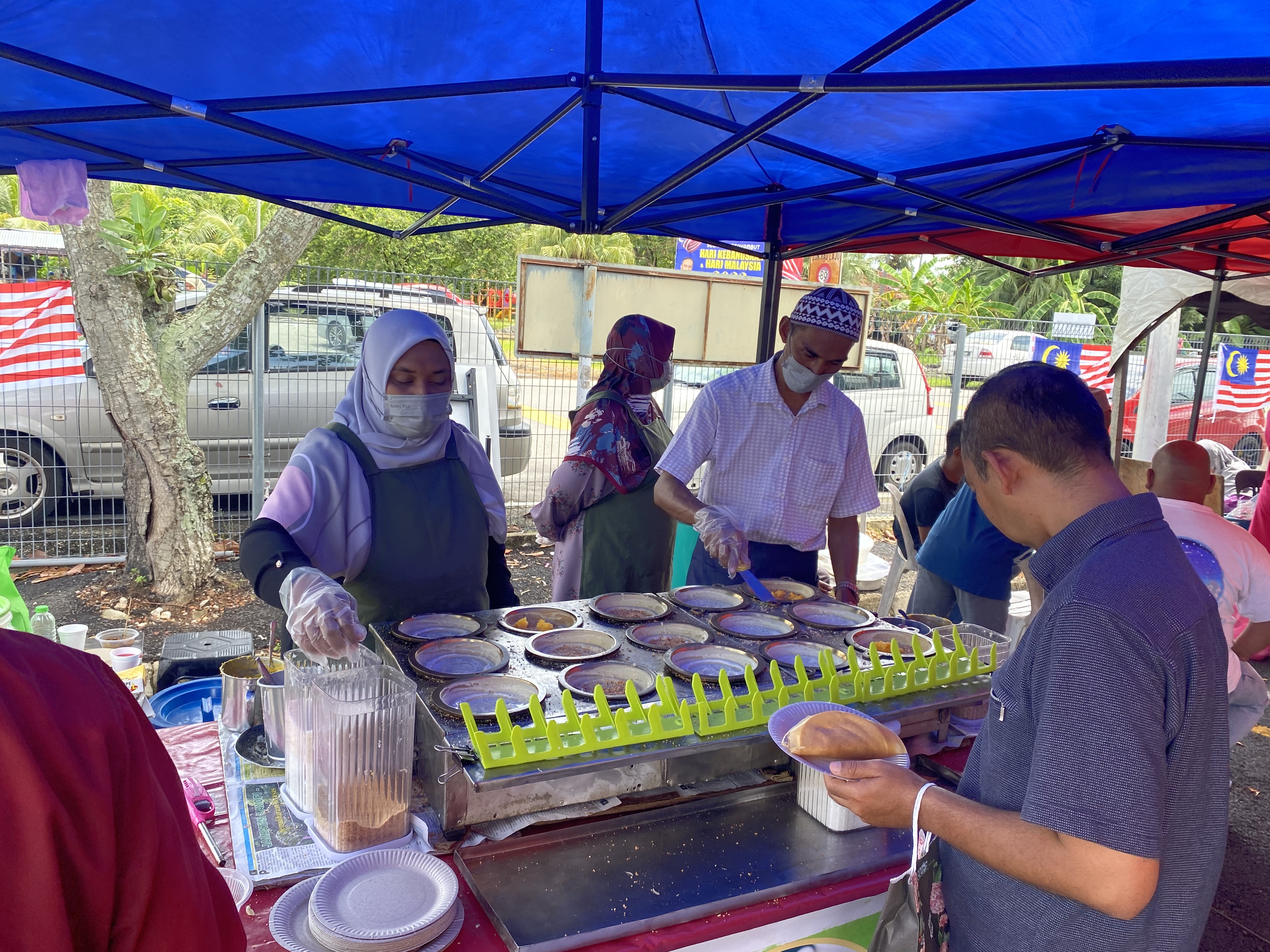 Deux buffets de nourriture sont répartis de chaque côté de l’entrée de la salle, avec bien entendu du riz dans des méga conteneurs comme ils le font souvent dans les buffets en Malaisie et du Nasi Lemak, plat typique malaisien que j’aime beaucoup. Nasi ça veut dire riz et lemak c’est la crème de noix de coco utilisée pour faire cuire le riz.