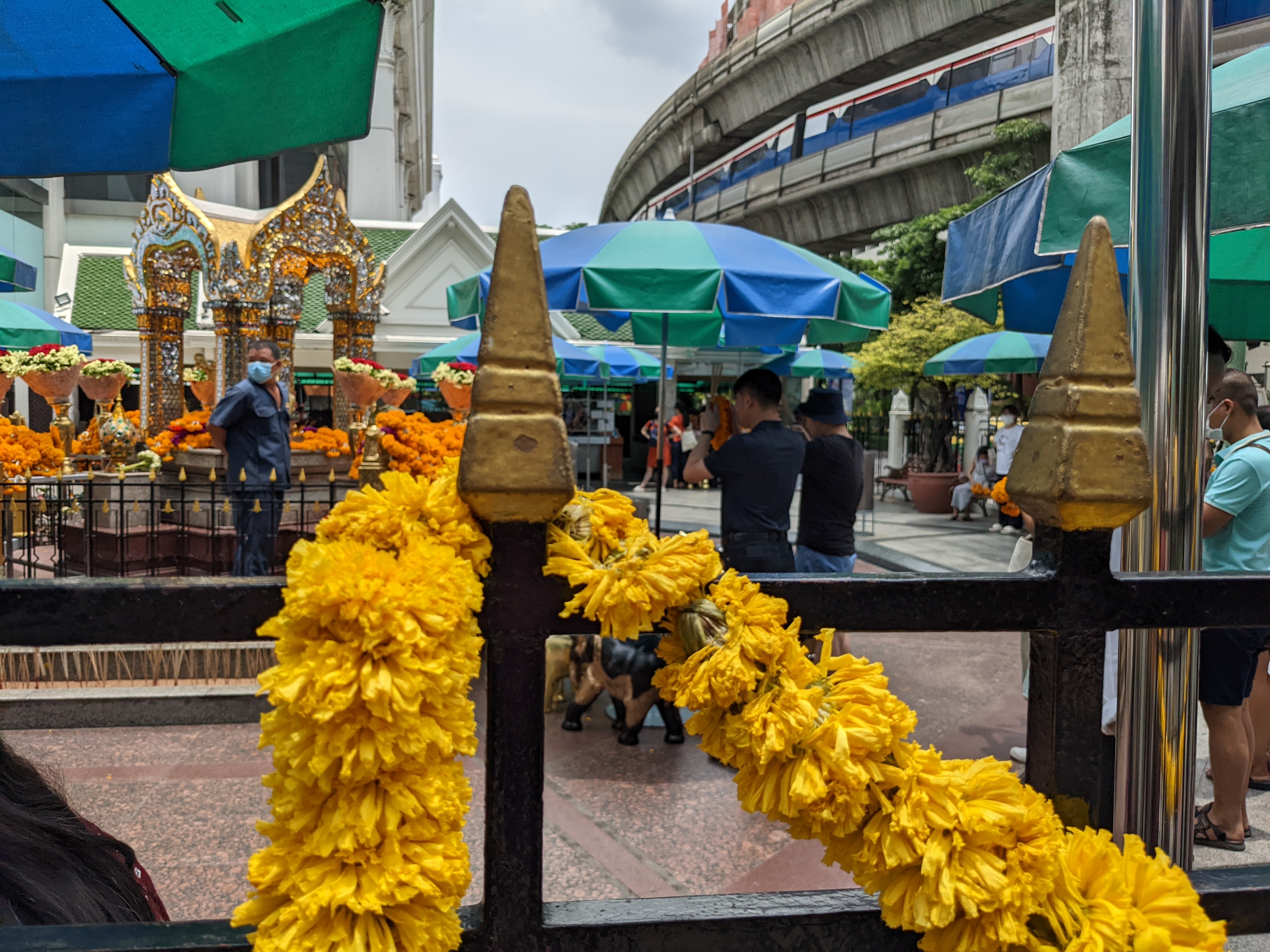 La Thaïlande c’est aussi un pays qui compte beaucoup, beaucoup de temples bouddhistes. Dans Bangkok, on peut trouver partout des petits autels qui abritent des bouddhas et devant lesquels les thaïlandais prient et déposent des colliers de fleurs.