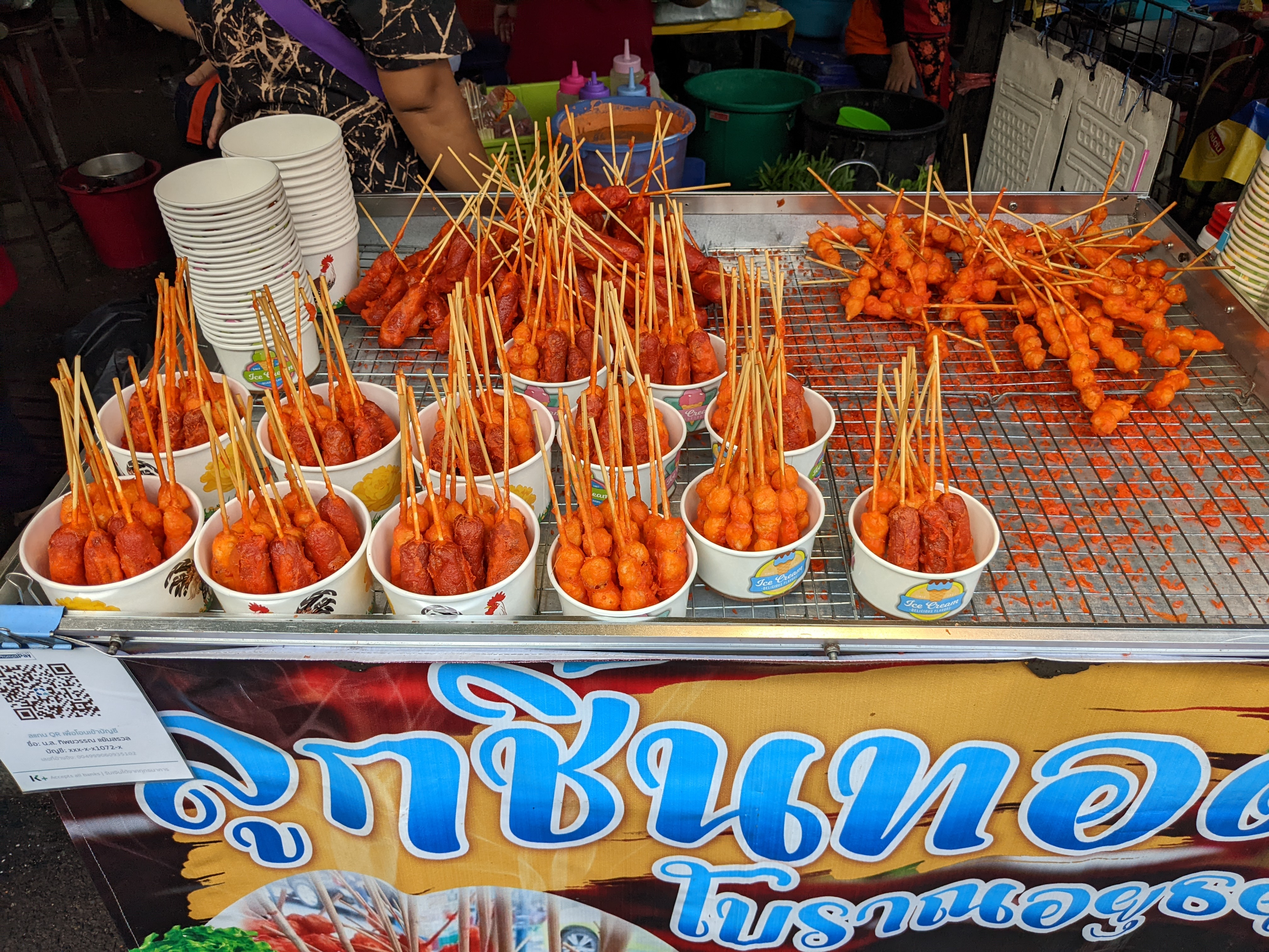 J’ai pu observer de nombreux stands partout en Thaïlande qui proposaient ce qui semblait être des saucisses ou du poulet, avec des couleurs très fluos. Je trouve que ça rendait bien visuellement mais ça ne m’a jamais vraiment donné envie d’en manger.