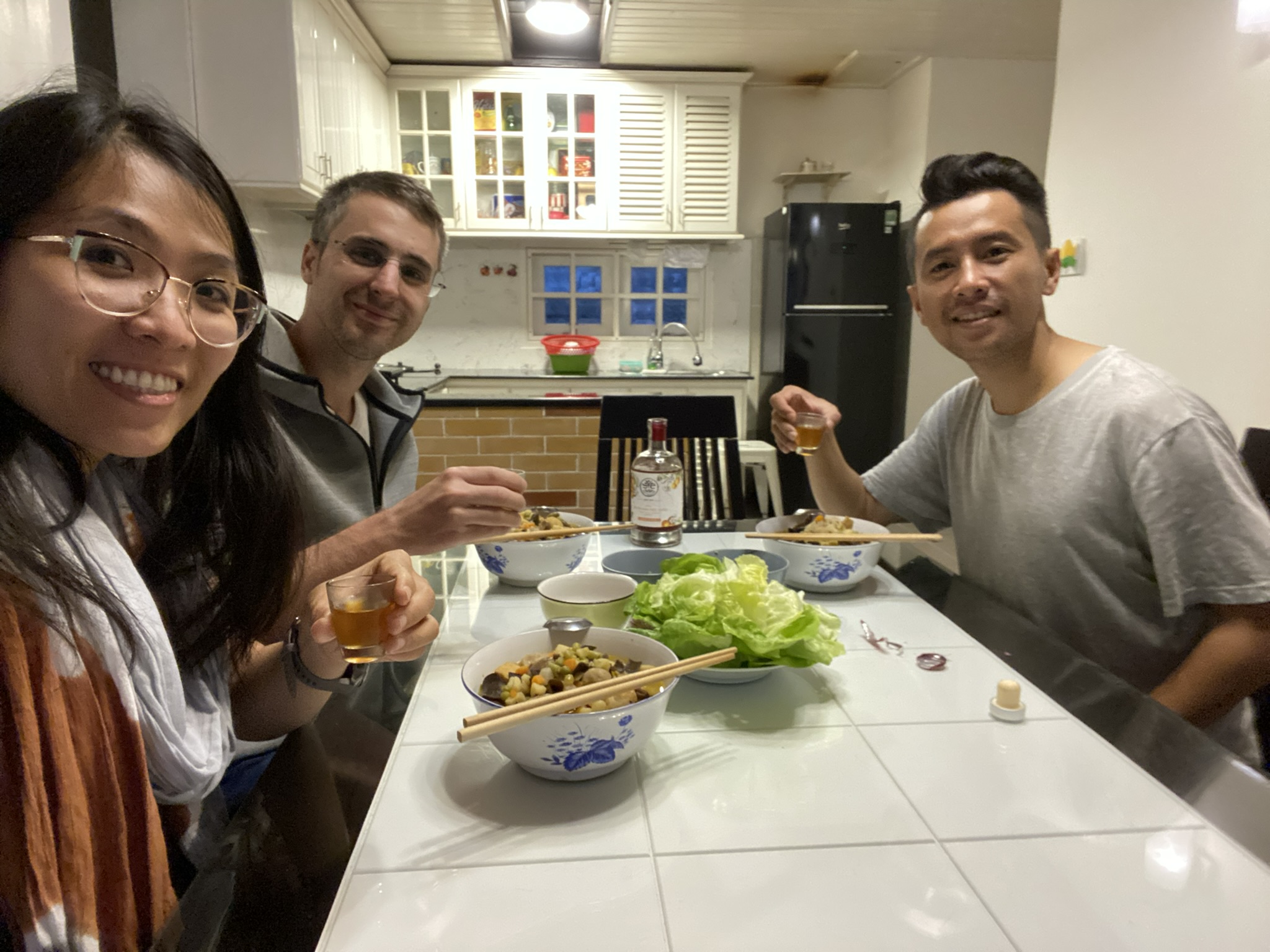 Nha me propose de me servir du vin, ce que j’accepte. Il sort donc 2 verres à shooters et une bouteille qui ne ressemble pas du tout à du vin, mais plutôt à un alcool beaucoup plus fort. J’apprends qu’il est de coutume de trinquer avant chaque gorgée, constate que ce “vin” est plutôt fort et décide de m’arrêter au bout de 3 petits verres avant que je ne commence à parler naturellement vietnamien.