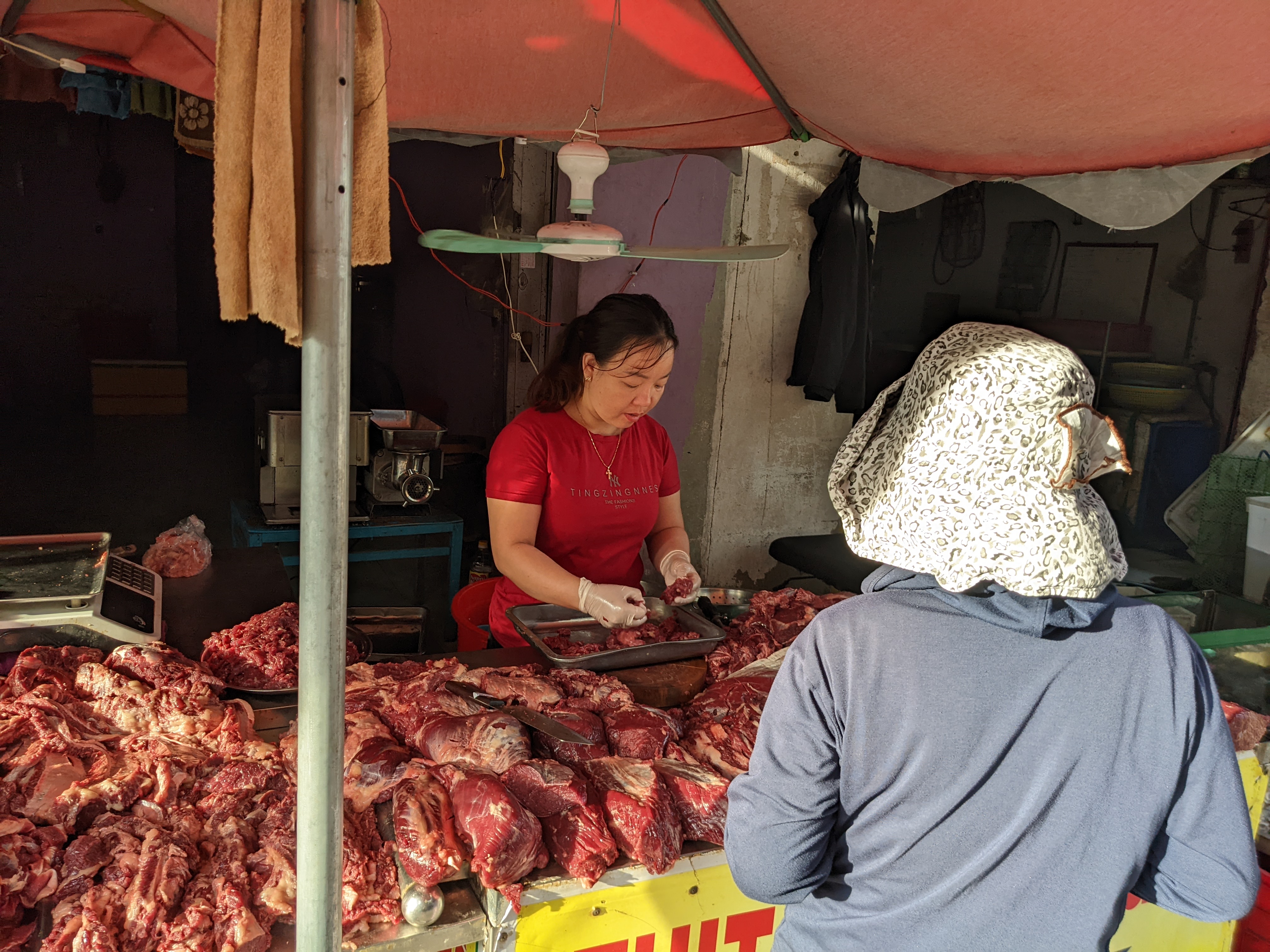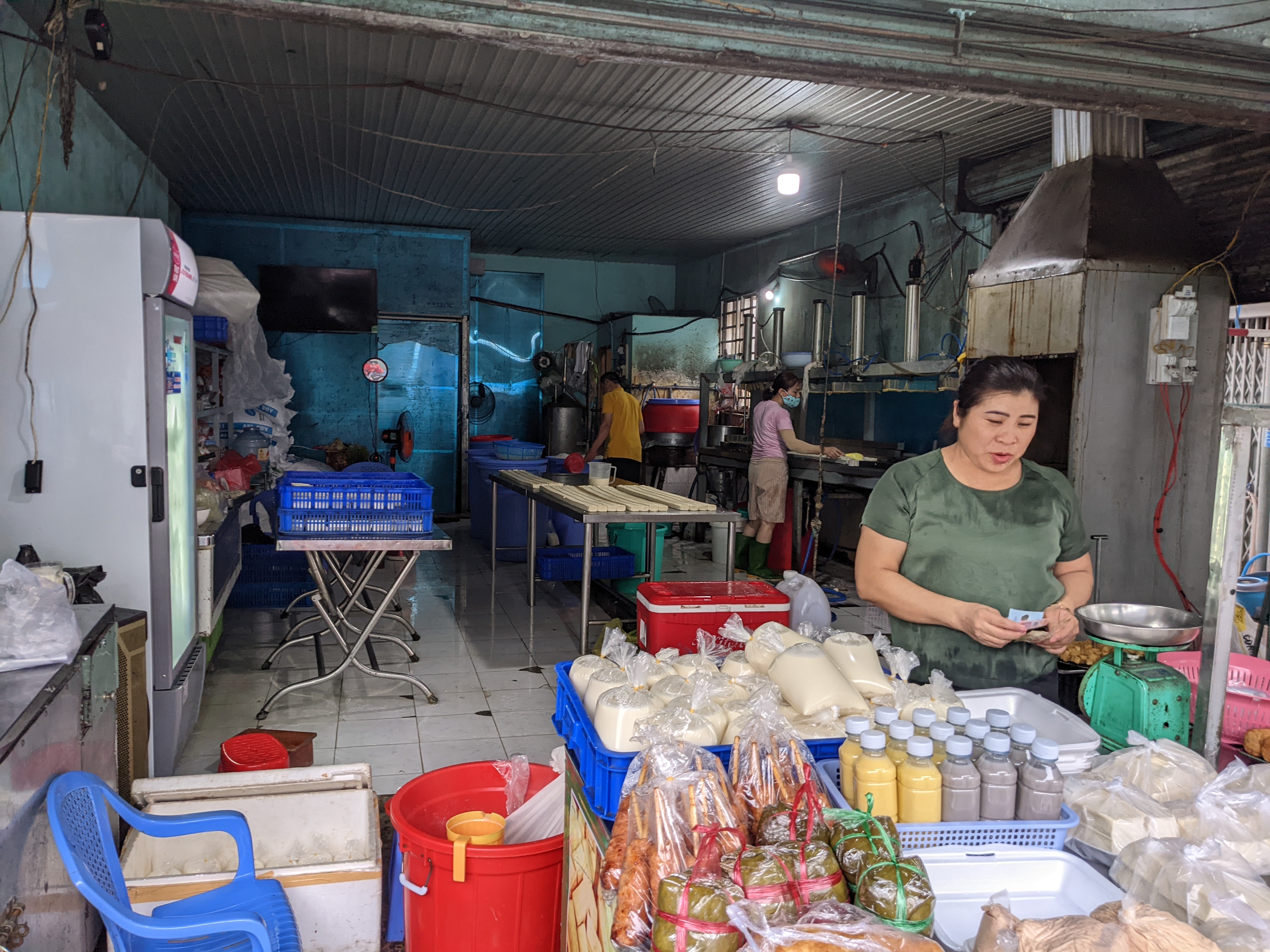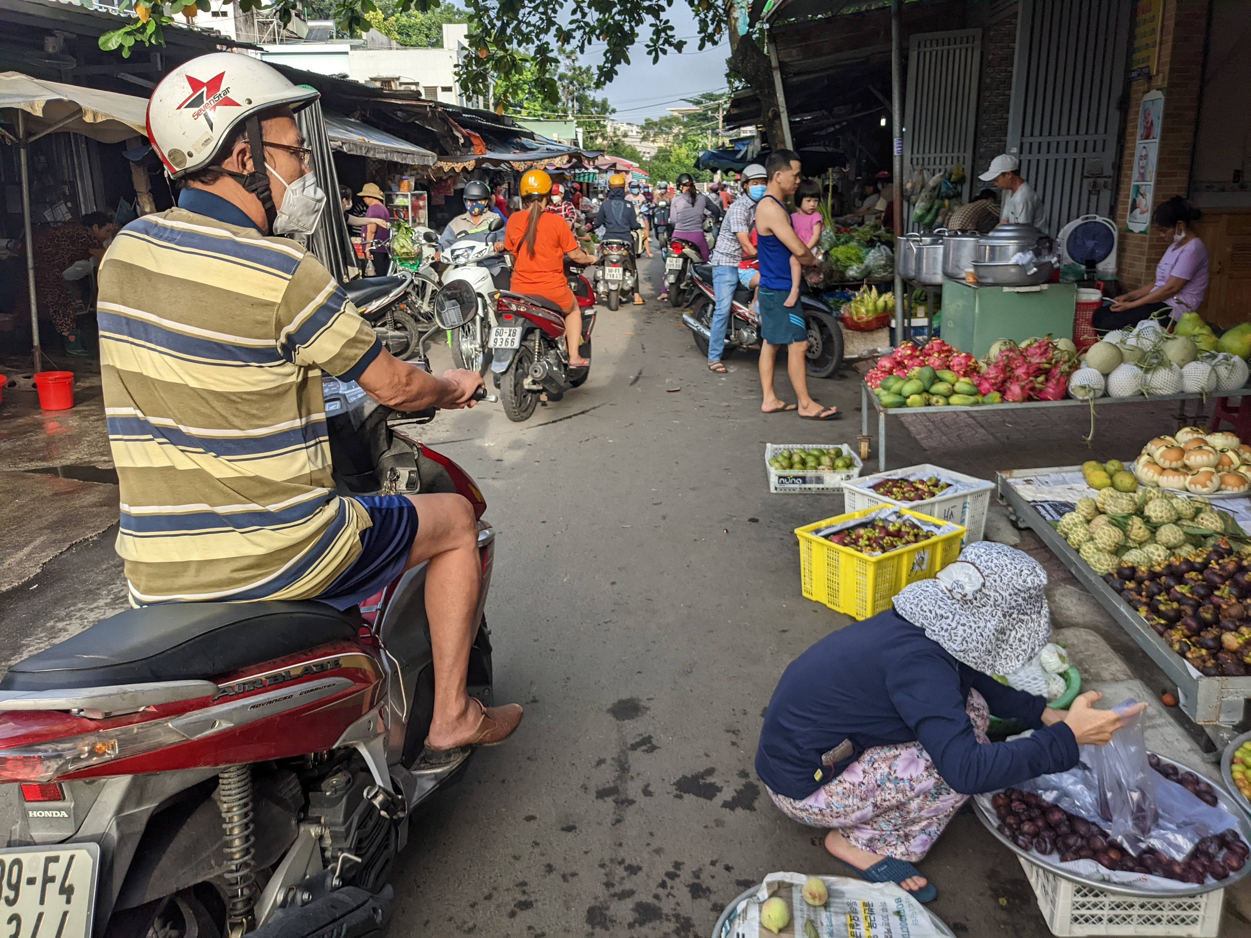 Un truc que j’aime moins, c’est que beaucoup de gens font leurs courses en deux-roues (oui ça me traumatise un peu vous l’aurez compris), et donc ça encombre un peu la circulation dans le marché à mon goût. Comme tous les matins, Mai achète des légumes, de la viande et du tofu, avec en plus ce jour-là des feuilles de riz pour faire des rouleaux de printemps.