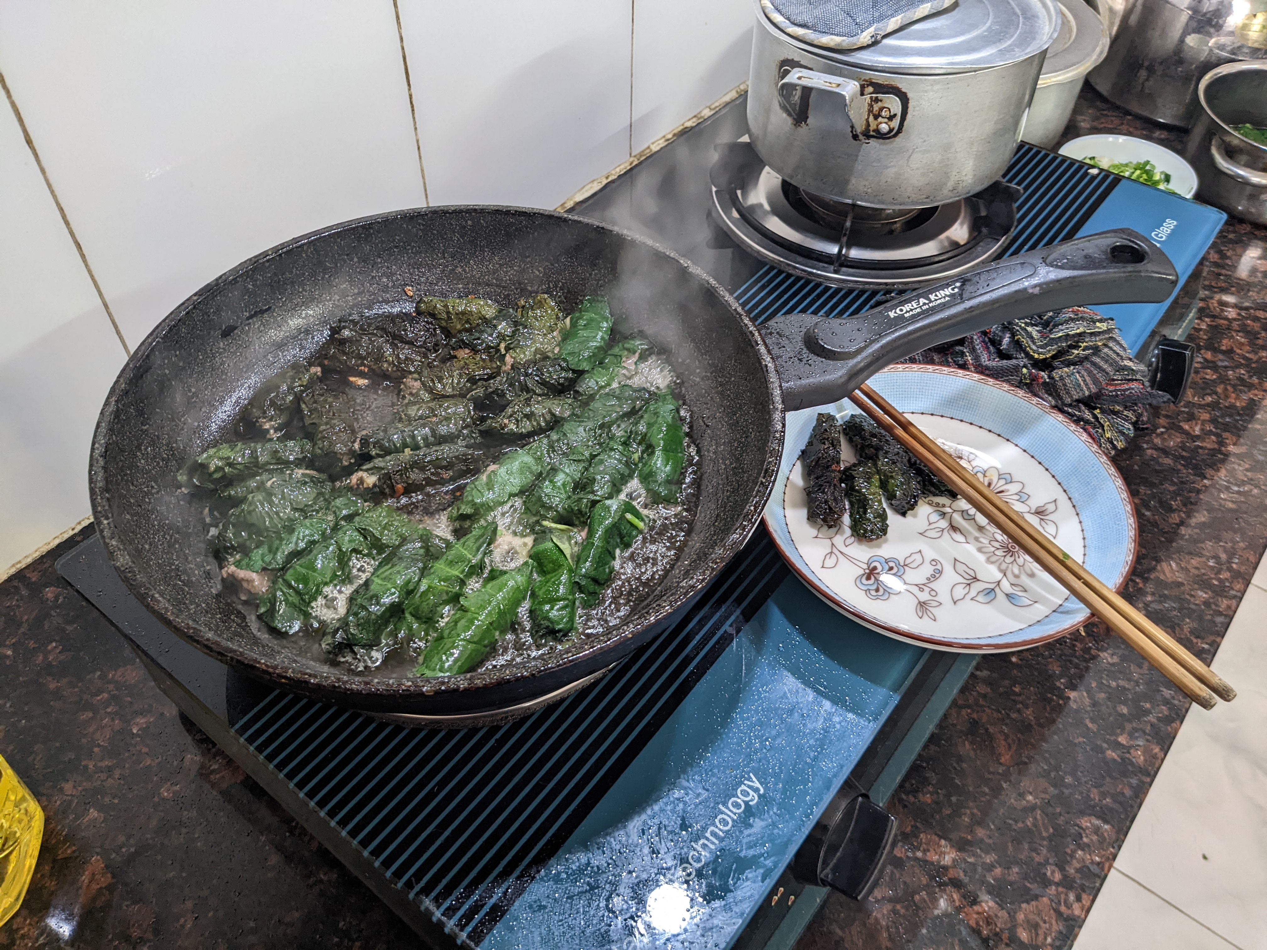 Une fois nos produits achetés, nous pouvons alors les utiliser pour en faire de délicieux petits plats. Cette fois-ci au menu du jour : des Bò lá lốt. Traduisez par bœuf aux feuilles de vigne. Une farce de boeuf émincé, ail, poivre, sel, sauce de poisson, le tout roulé dans une feuille de vigne, que l’on fait ensuite frire. L’huile n’y reste pas accrochée et ce n’est pas vraiment gras. Une de mes meilleures découvertes culinaires dans ce pays, à coup sûr !