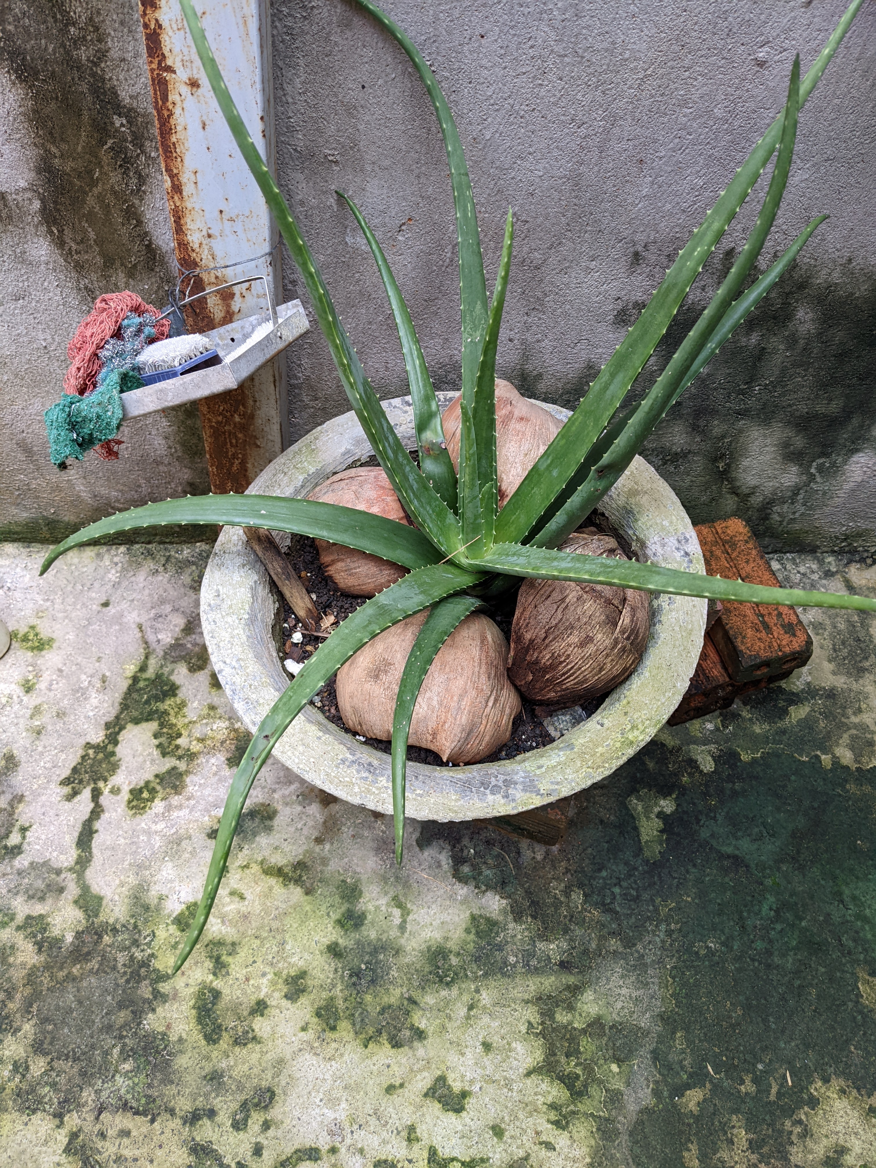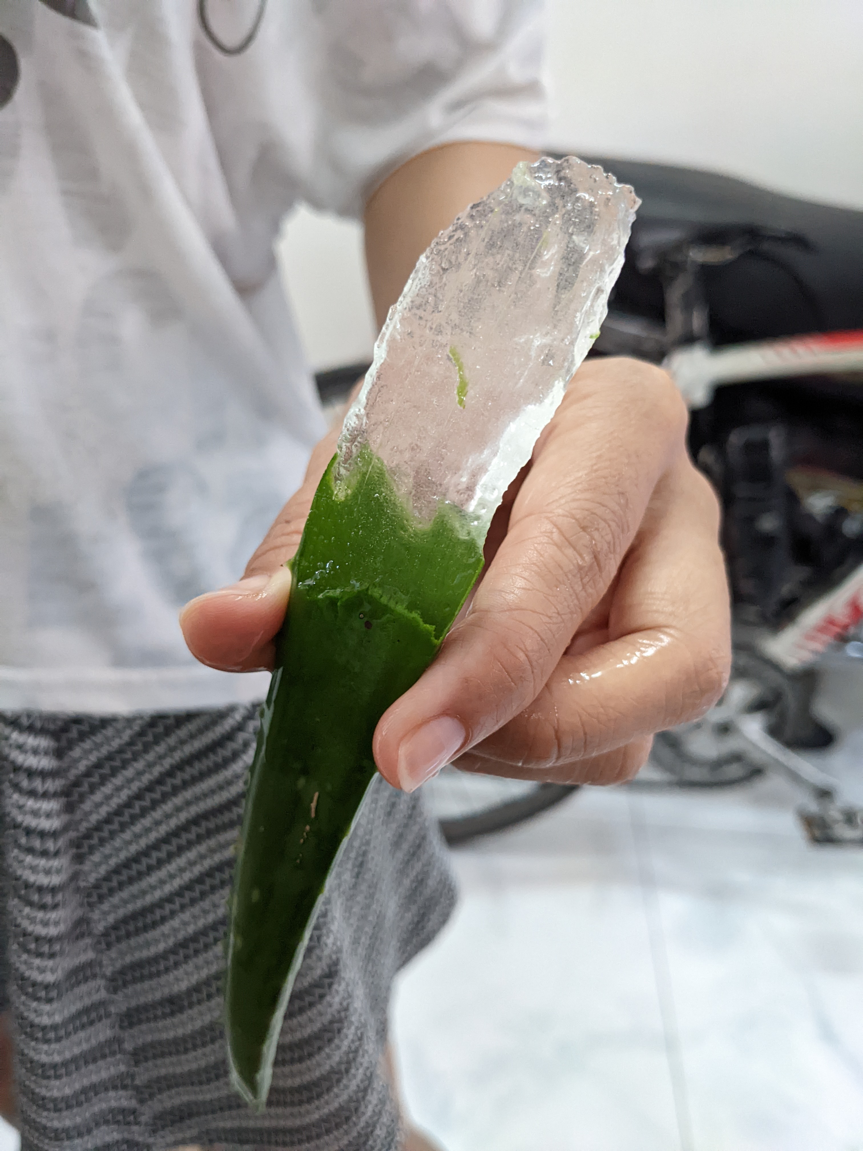 Une fois j’ai chopé des gros coups de soleil aux cuisses parce que je n’avais pas anticipé que le soleil taperait si fort dessus pendant une longue balade en scooter. Pas de problème, il n’y a qu’à se servir en aloe vera dans le jardin ! Terriblement pratique et la première fois pour moi que je vois cette plante.