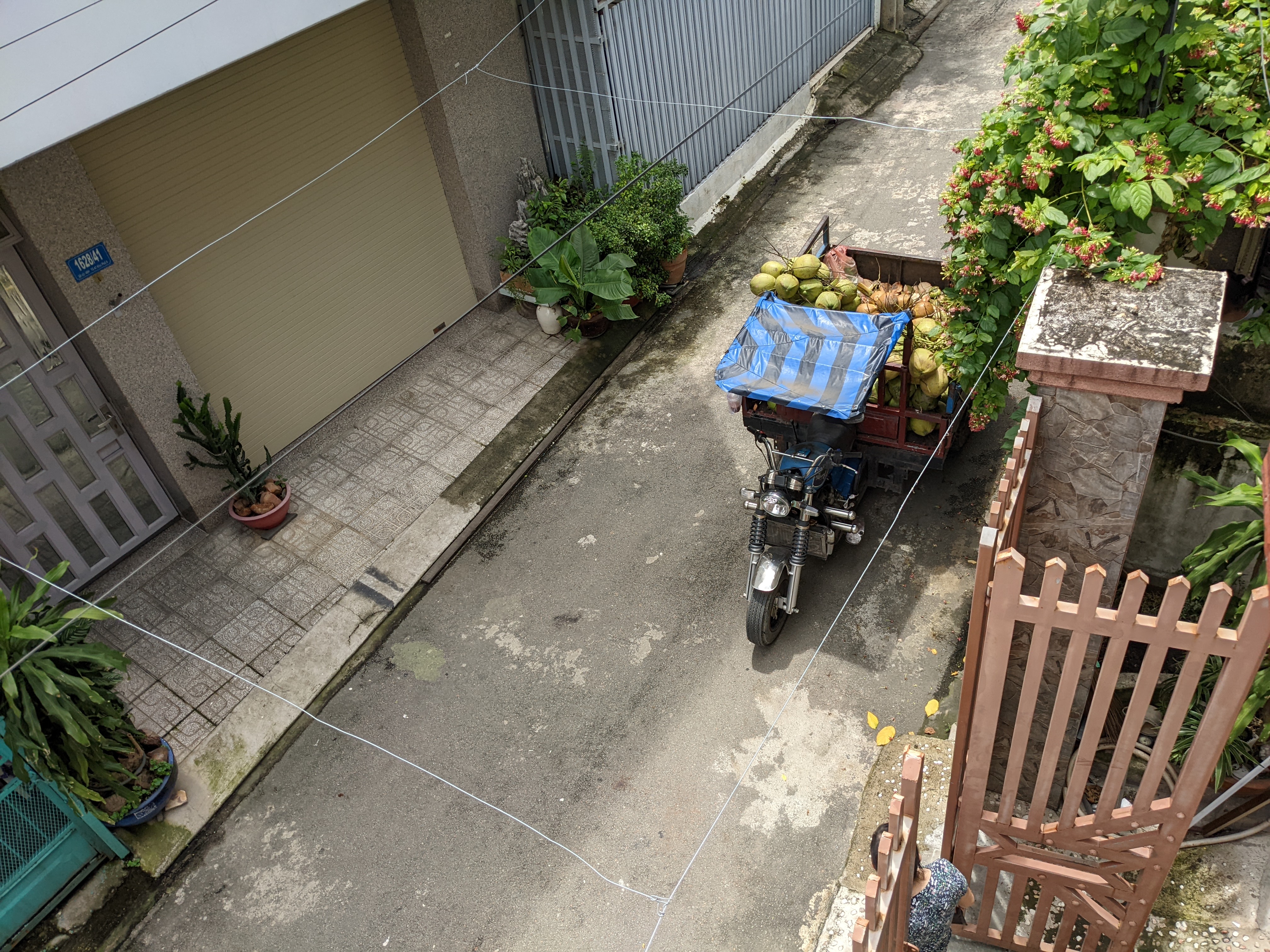 Un marchand ambulant de noix de coco ! Les marchands ambulants, c’est vraiment une des particularités du Vietnam que j’aime beaucoup. Je sors donc dans la rue et observe Mai en train de marchander avec le vendeur ambulant. Ce dernier transporte deux types de noix de coco différents : des vertes et des pas mûres marrons.