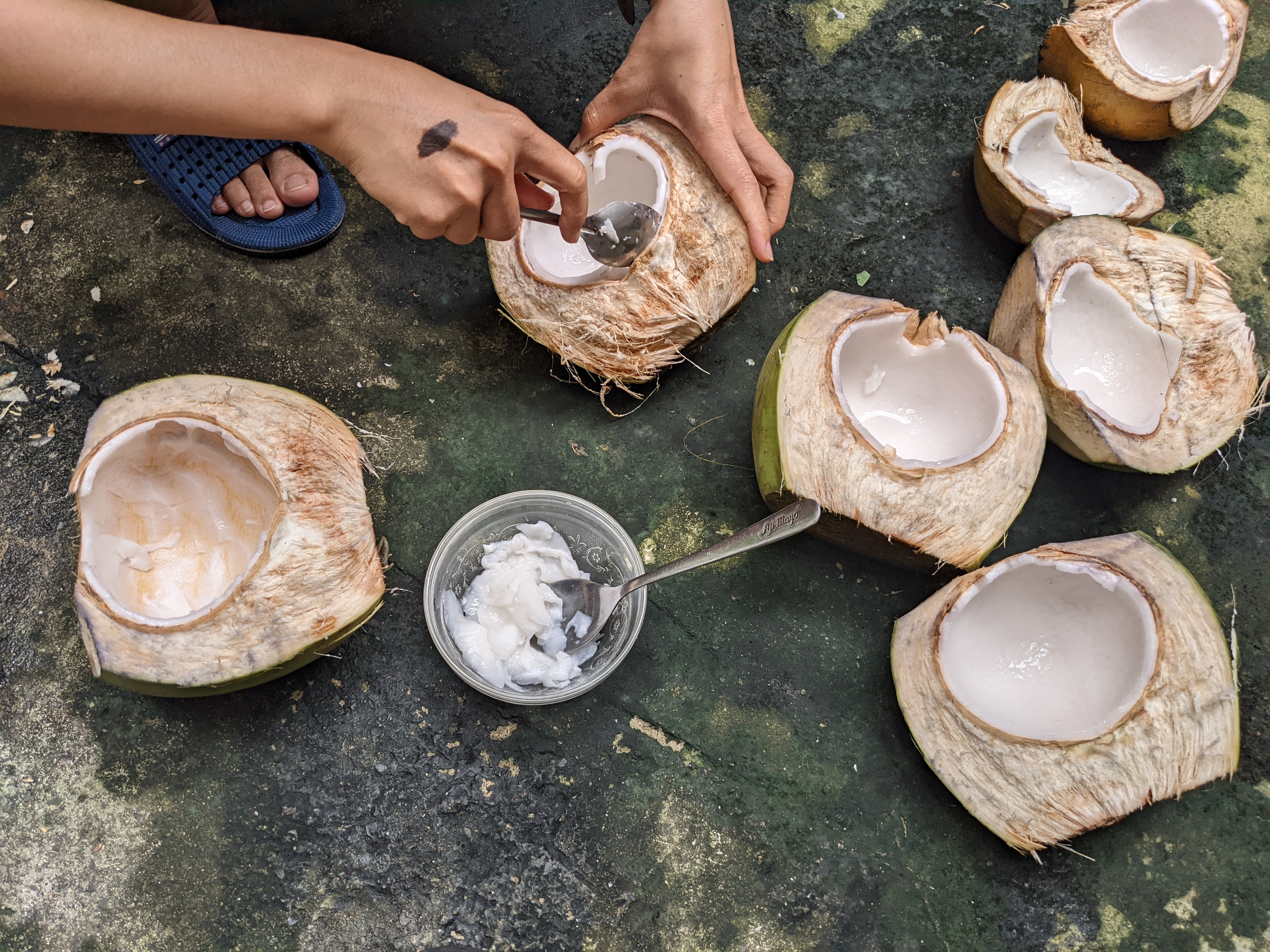 Une fois le marchandage et la transaction effectués, il est temps pour nous de se rendre dans l’arrière-cour et de faire parler le coupe-coupe. La mission consiste à trancher les noix de coco en deux, puis à curer les vertes à la cuillère pour en extraire la partie blanche. On peut ensuite se faire un petit cocktail tropical à base de jus de coco, de la partie blanche et de bloc de glace. Délicieux !